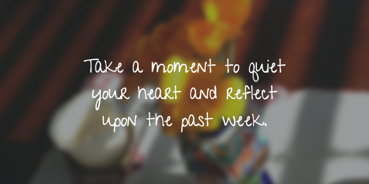 Take a moment to quiet your heart and reflect upon the past week. Look especially for ways to express gratitude and thanksgiving to God for his goodness and love, as well as genuine sorrow over your own sin and brokenness. Close this time of prayer by expressing your hope in the power of the Holy Spirit who is faithful to forgive, cleanse, and transform you into his likeness (2 Cor. 3:18). (source)