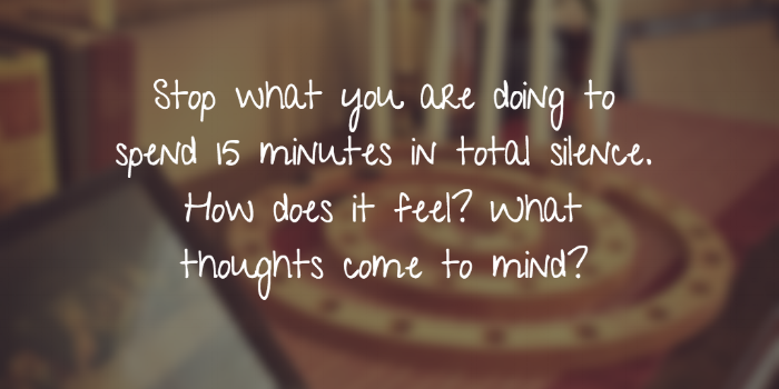 Stop what you are doing for about 15 minutes to sit in total silence. How does it feel? What thoughts come to mind?